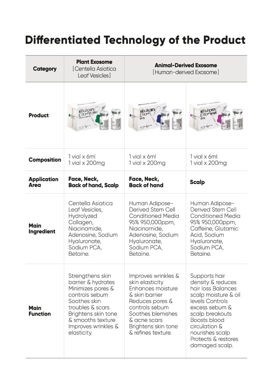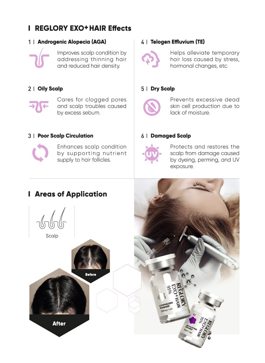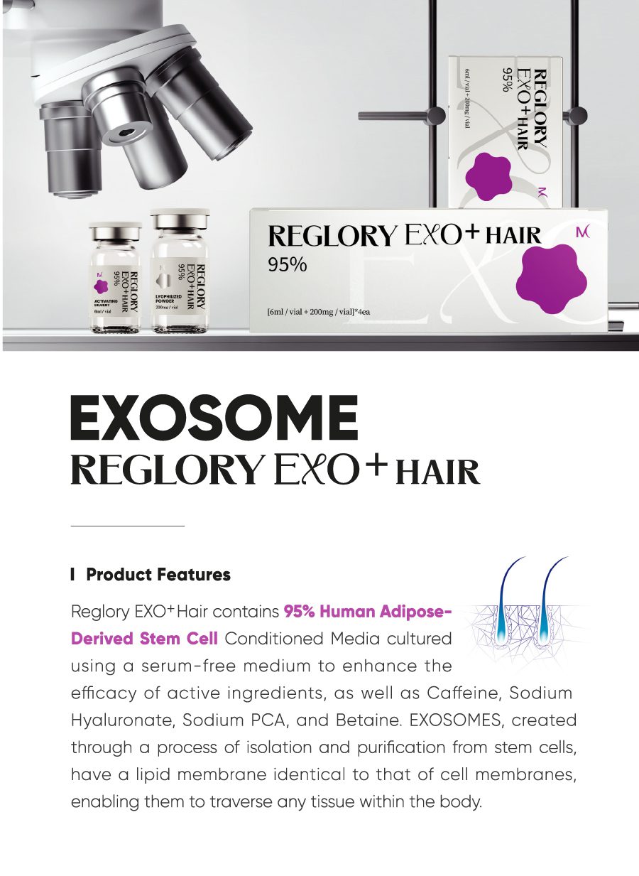 Reglory EXO+ Hair bevat 95% van menselijke vetweefsel afgeleide stamcellen, geconditioneerd medium gekweekt met behulp van een serumvrij medium om de werkzaamheid van actieve ingrediënten te verbeteren, evenals cafeïne, natriumhyaluronaat, natrium PCA en betaïne.