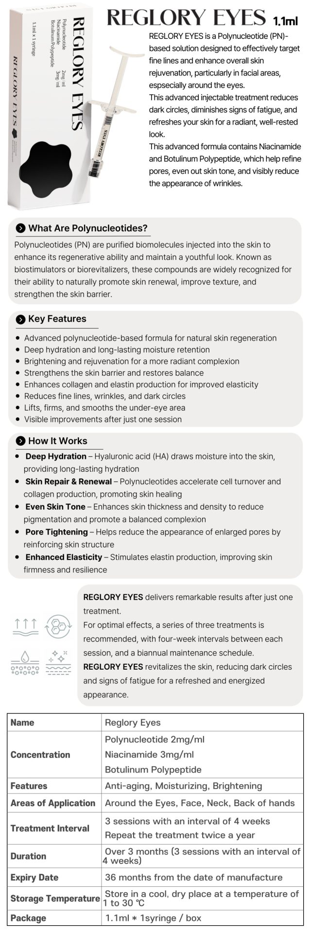 REGLORY EYES is a Polynucleotide (PN)-based solution designed to effectively target fine lines and enhance overall skin rejuvenation, particularly in facial areas.